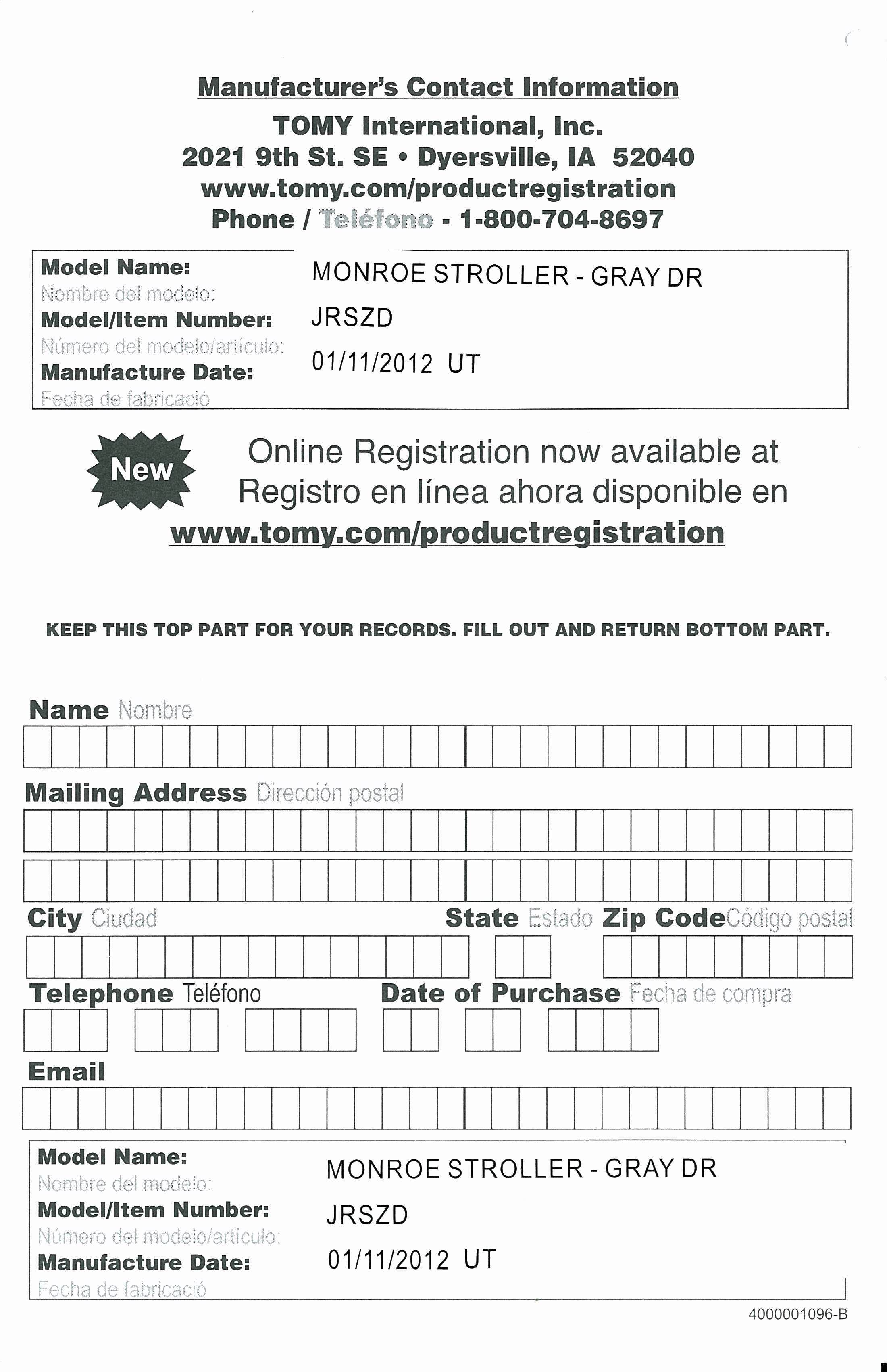 You may register online selected TOMY durable nursery products or you may register using the mail-in card that came with your product. Please do not register by both methods -- use only one method.